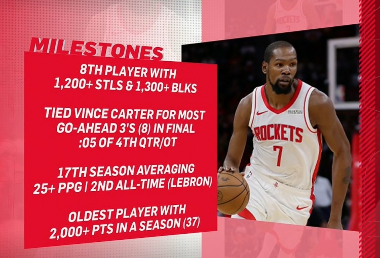 九游娱乐平台-KD本季里程碑:历史最老单季2000分先生 生涯17次单季25+仅次老詹
